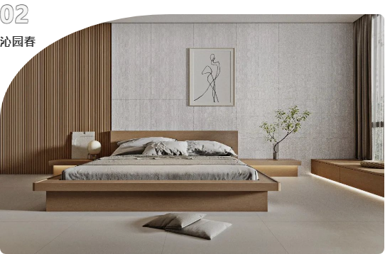 床與飄窗間插上清新插枝,舒適的氣息在進門剎那便撲面而來。原木色系帶來的溫暖氛圍,結合宋素|凡古磚精雕工藝帶來的細膩肌理,原生態的質感,呈現出一個素凈的雅居空間。