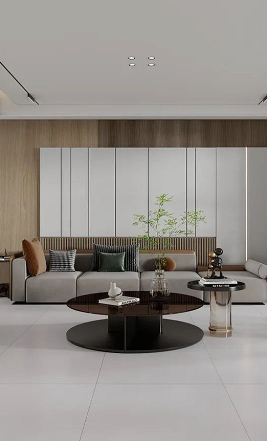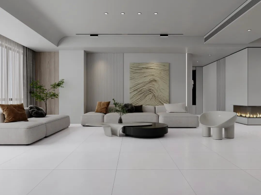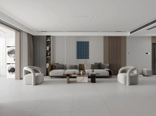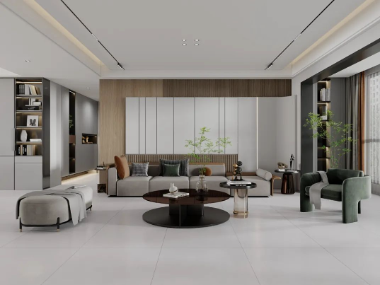 地面采用滿庭芳,表面質地柔和,淡淡灰色搭配木質背景墻及綠植元素,仿佛被輕紗籠罩,細膩的紋理和微妙的陰影效果,潔凈無雜質,800X800mm經典規格通鋪客廳,清新淡雅中營造出質樸又高級的空間氛圍。